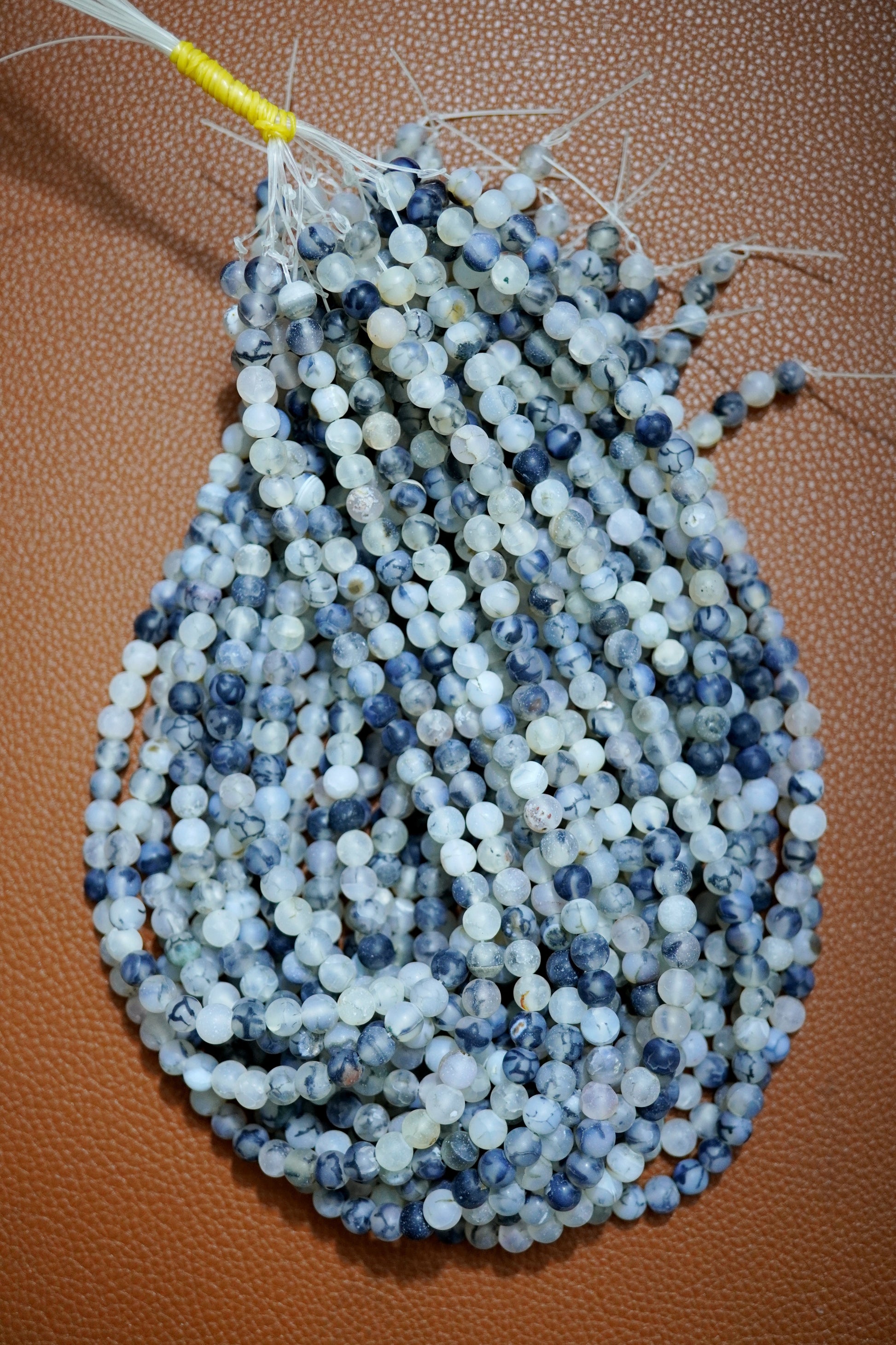 Spider Web Agate is a milky white Agate with black patterns that resemble spider webs. This pattern is created by heating grey Agate just enough for cracks to form. It is in these cracks that the dye seeps in, leaving behind a Spider Web pattern. These particular strands have a Matte finish.