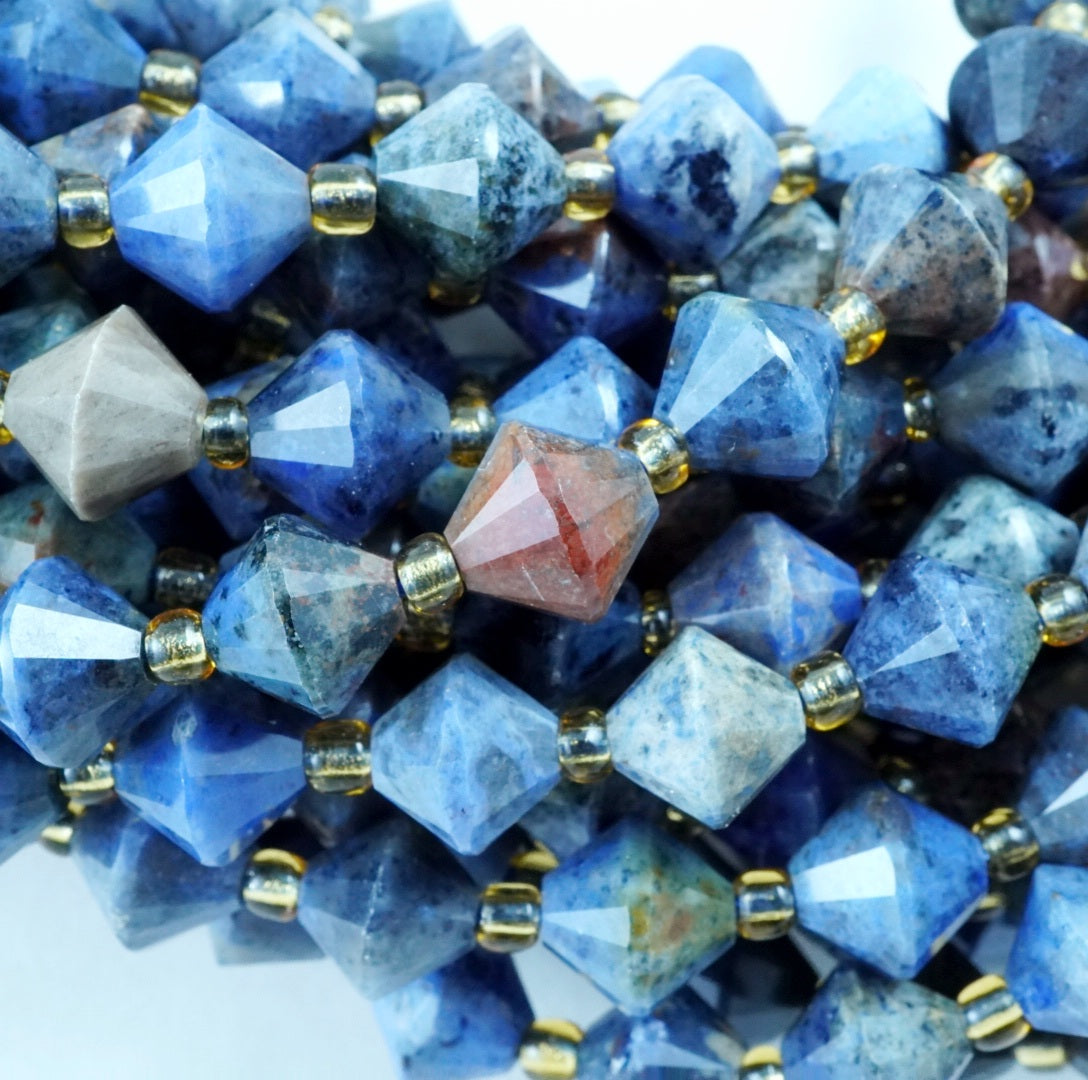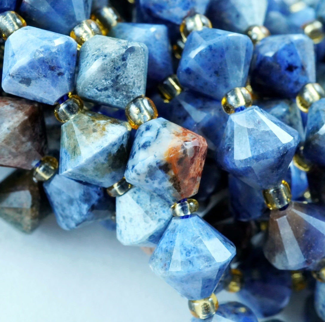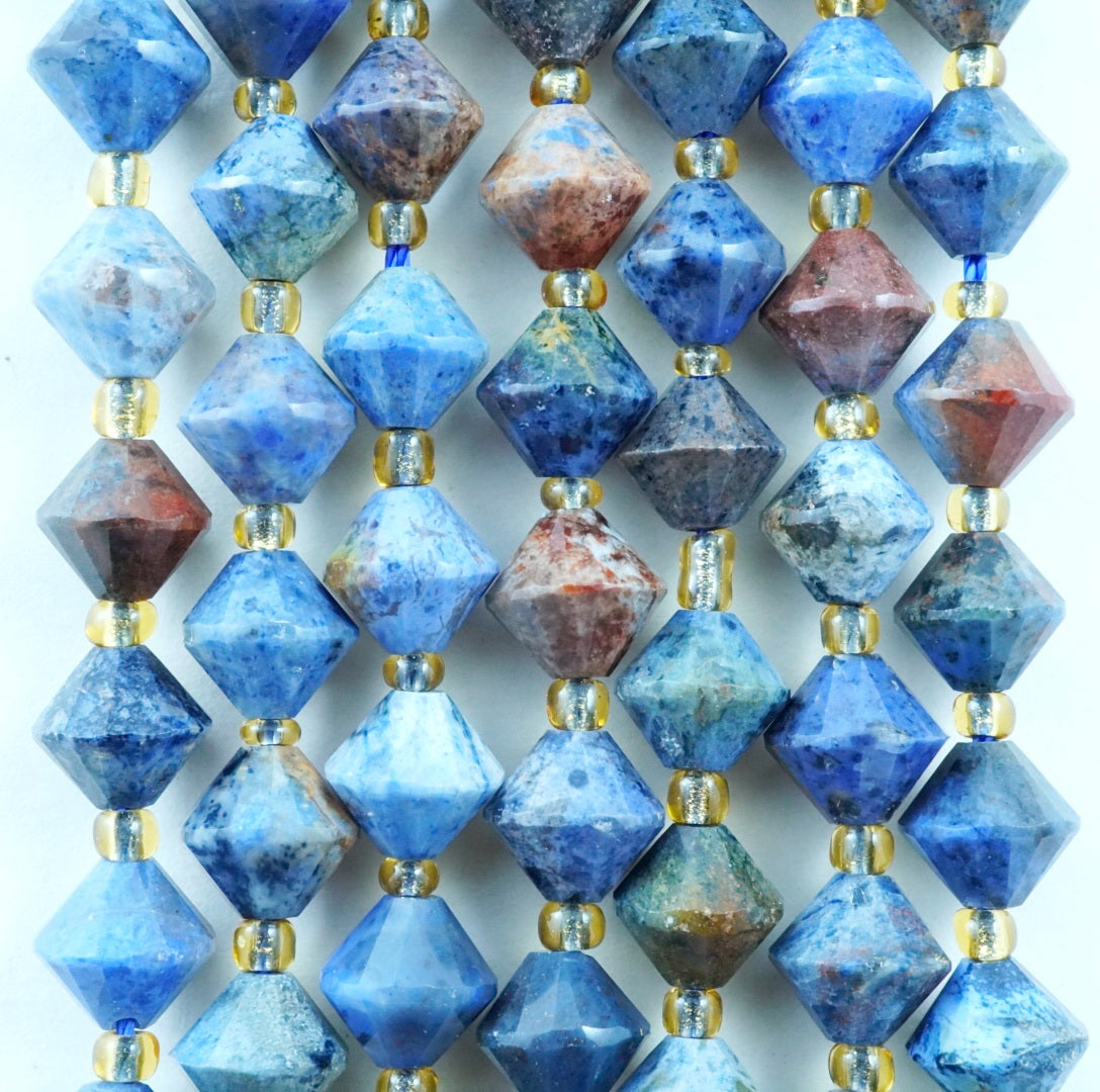 Sunset Dumortierite is a variation of blue Dumortierite with beautiful shades of tan, red, and brown in between. These particular beads have been cut and polished into stunning Faceted Bicone Beads.