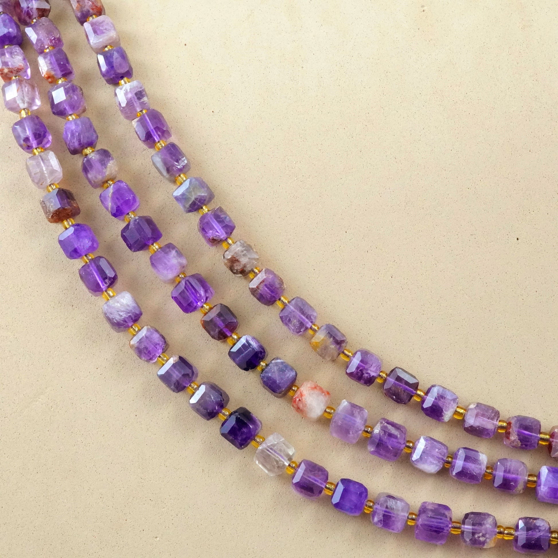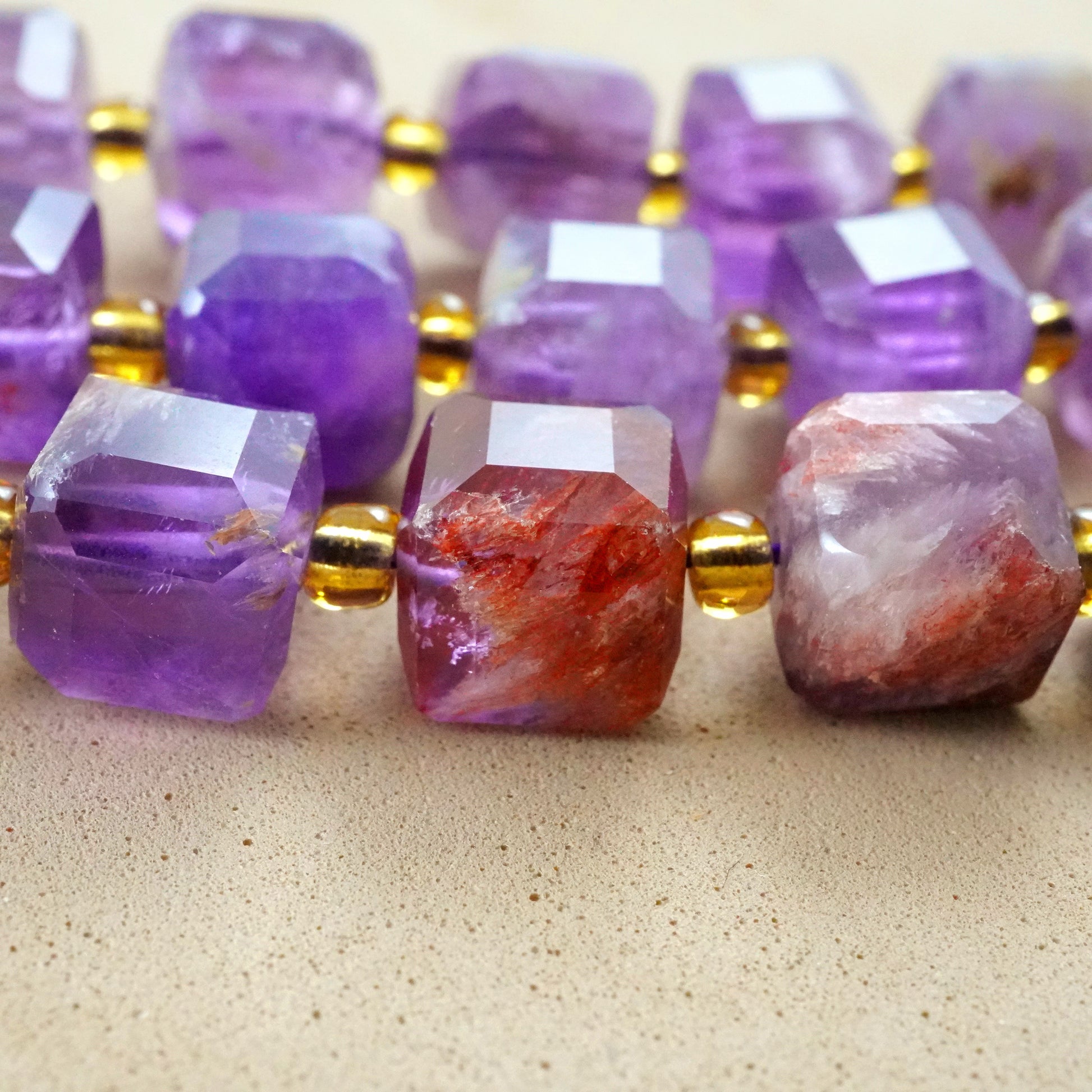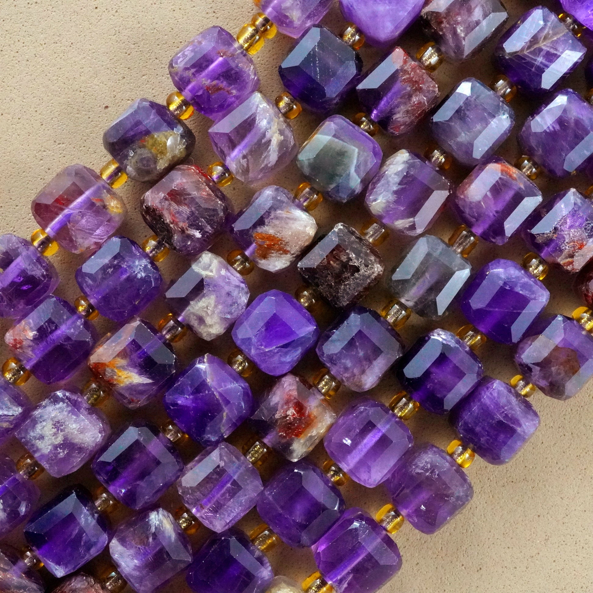 Super 7, also known as Melody Stone or Sacred Seven, is a rare and unique gemstone that is composed of seven different minerals: amethyst, clear quartz, smoky quartz, rutile, goethite, lepidocrocite, and cacoxenite. It is believed to have powerful spiritual and healing properties due to the combination of these minerals. When cut into faceted cube beads, Super 7 creates an amazing and mesmerizing look that showcases the natural beauty and complexity of this gemstone. Super 7 is also a relatively hard gemstone, with a hardness rating of 7 on the Mohs scale, which makes it an excellent choice for cutting and shaping into various forms, including cube beads. Overall, Super 7 in faceted cube bead form is an amazing and extraordinary gemstone that is perfect for creating stunning and meaningful jewelry pieces that are sure to captivate and inspire.