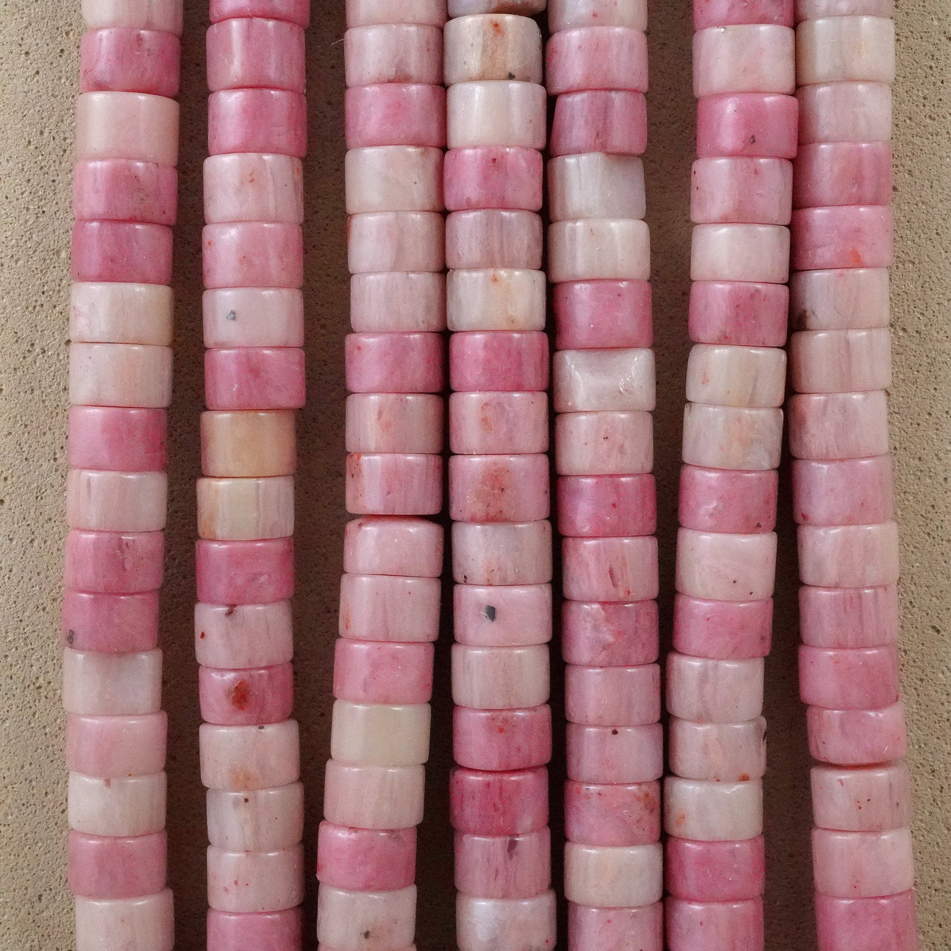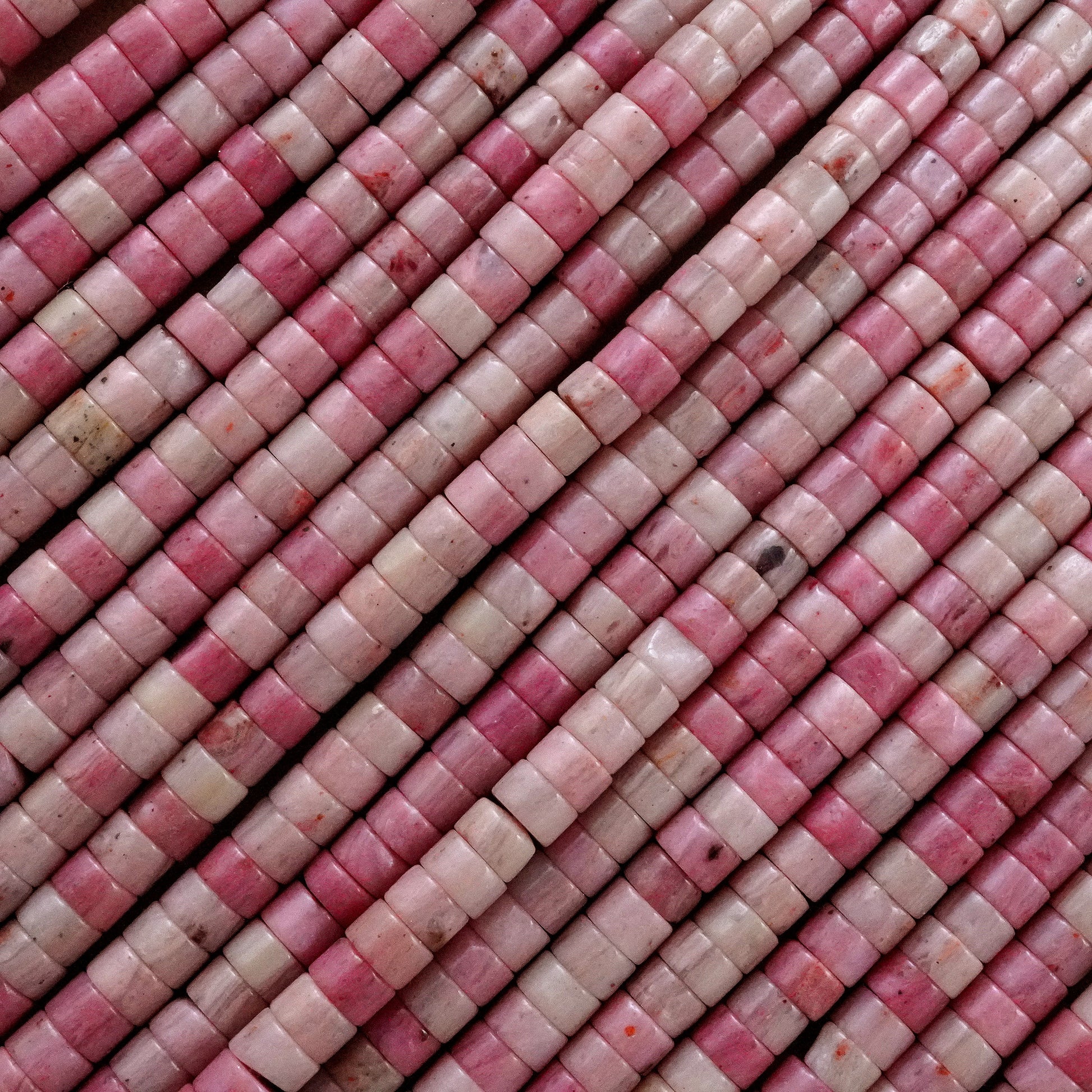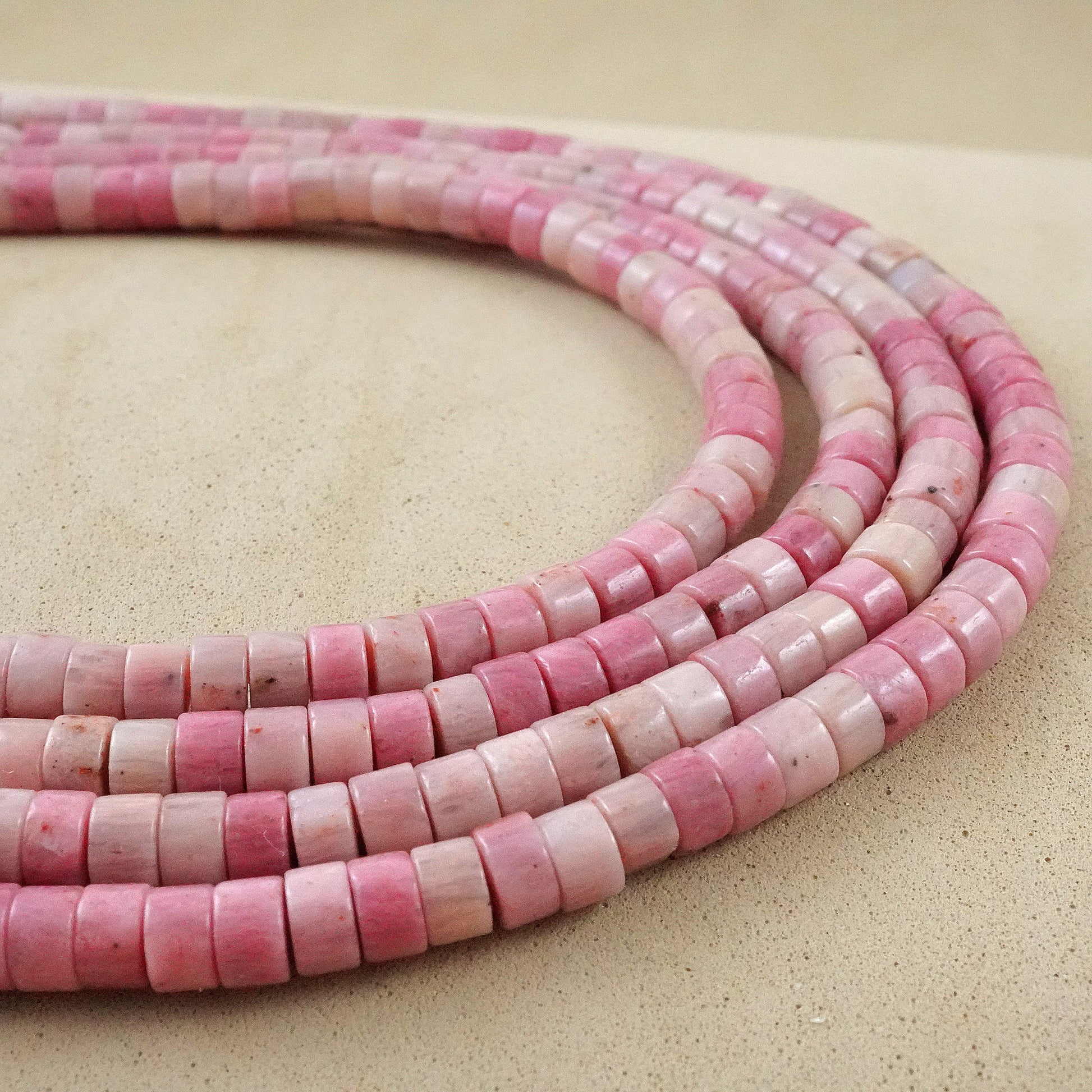 Thulite is a beautiful stone, made even more stunning when cut into 4mm Heishe beads. Enjoy 15" strands of the delicate pink bead that will add a subtle, yet eye-catching impact to any look.