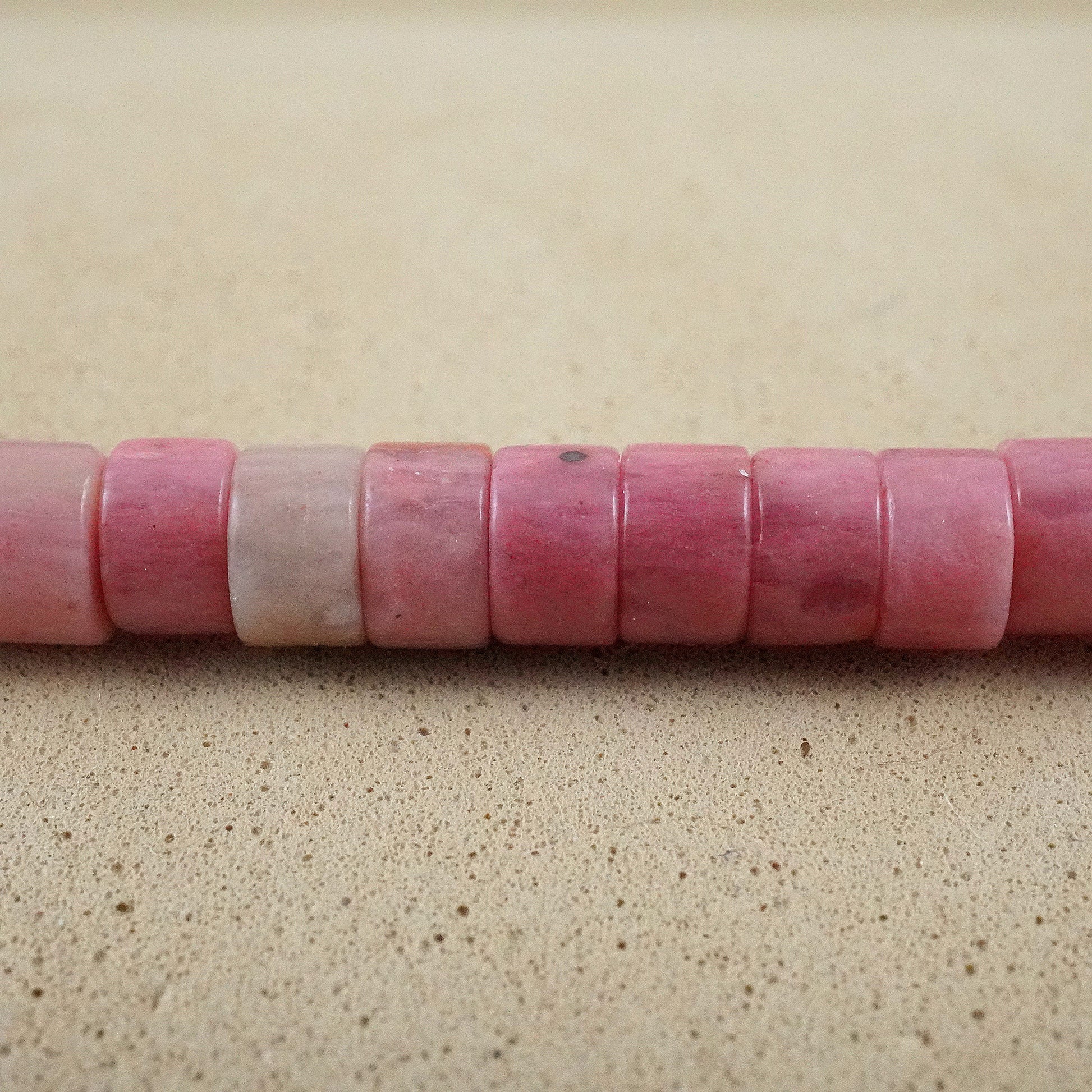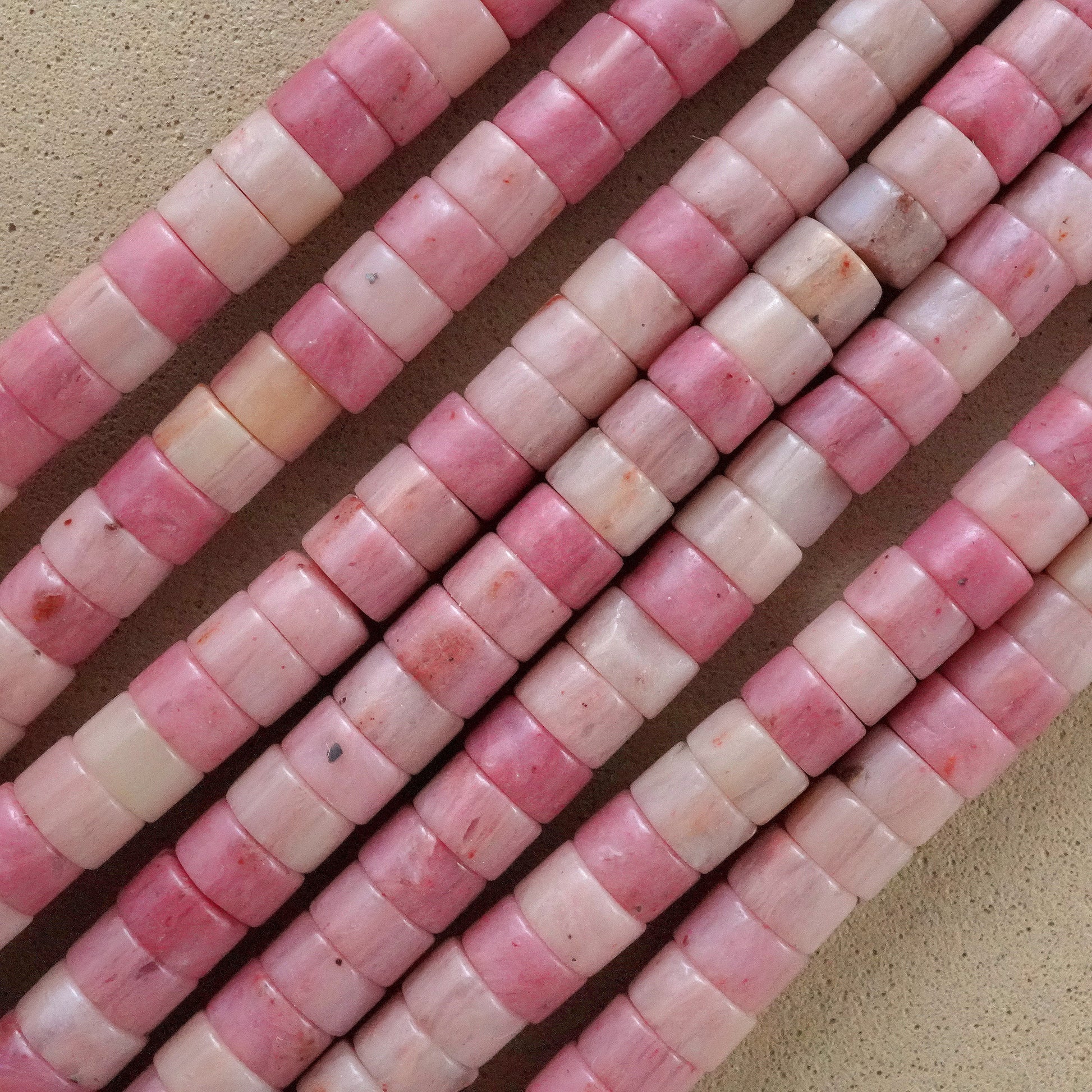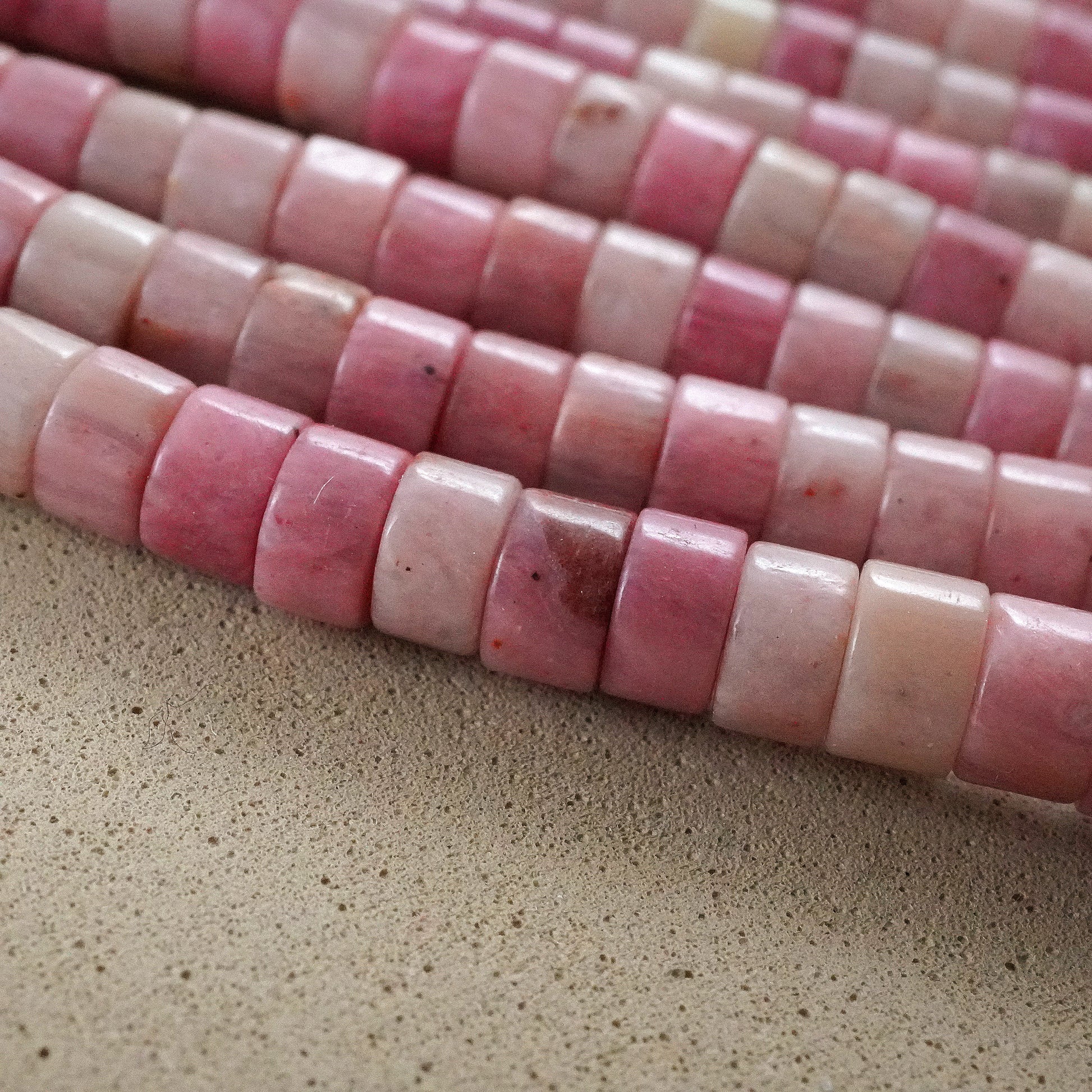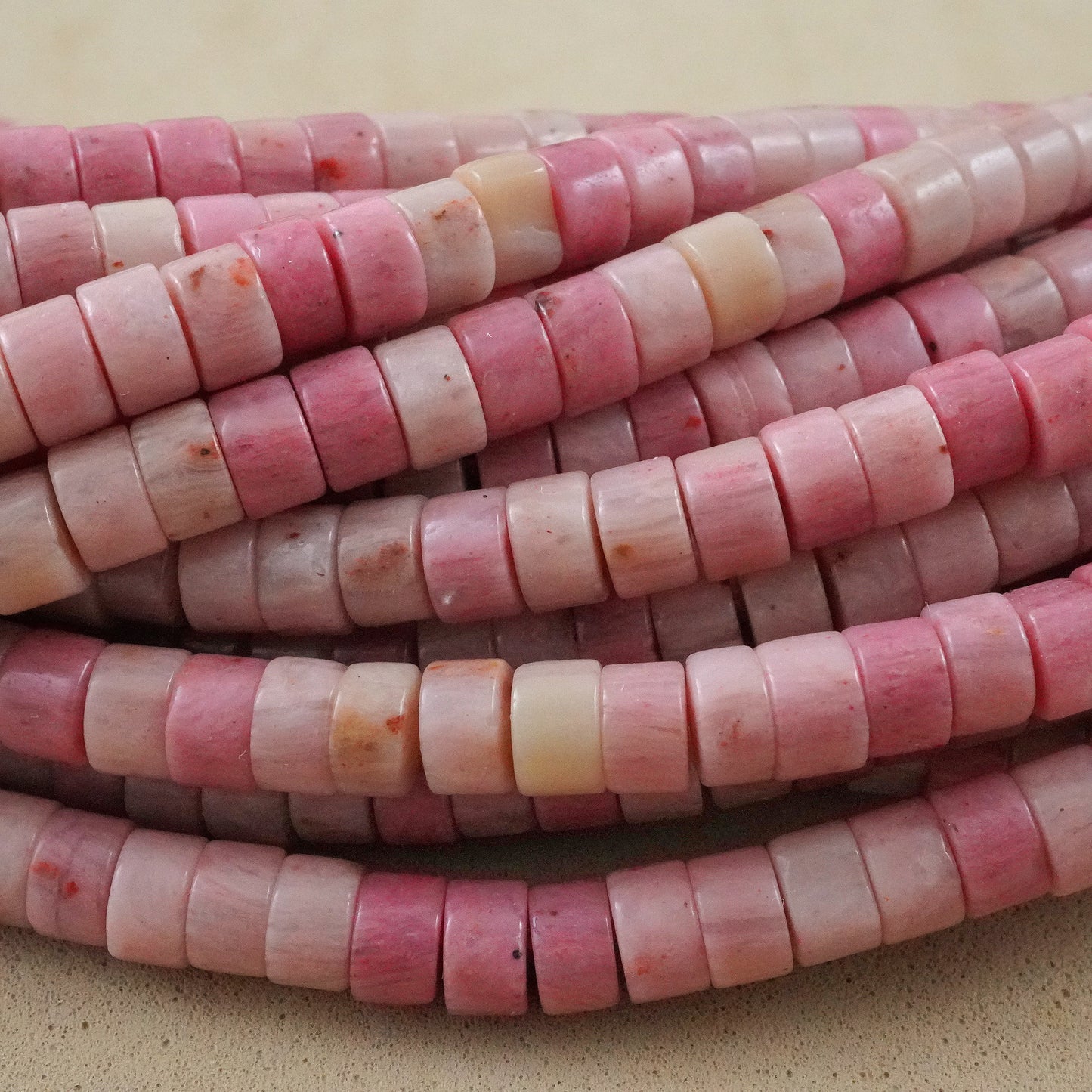 Thulite is a beautiful stone, made even more stunning when cut into 4mm Heishe beads. Enjoy 15" strands of the delicate pink bead that will add a subtle, yet eye-catching impact to any look.
