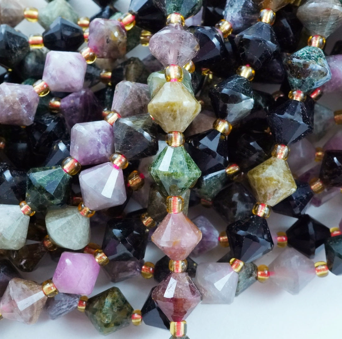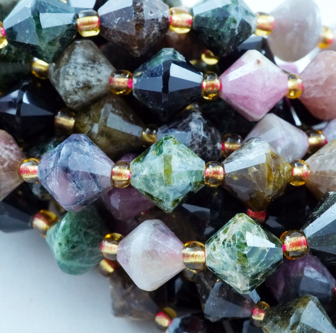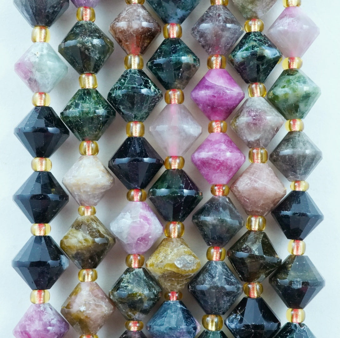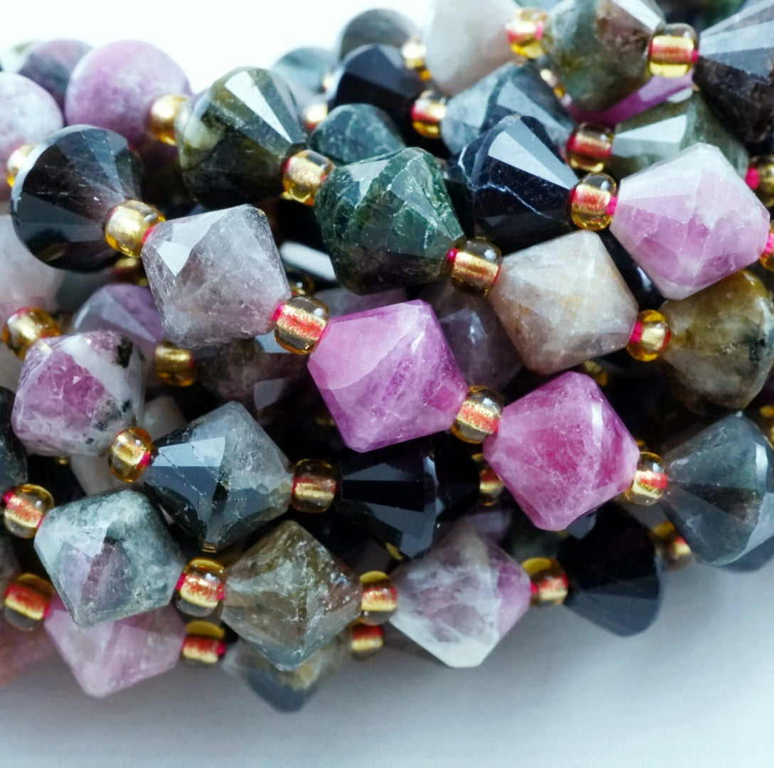 Watermelon Tourmaline is the name given to Tourmalines that are both green and pink in one crystal. These particular beads are cut and polished into beautiful faceted bicone beads.