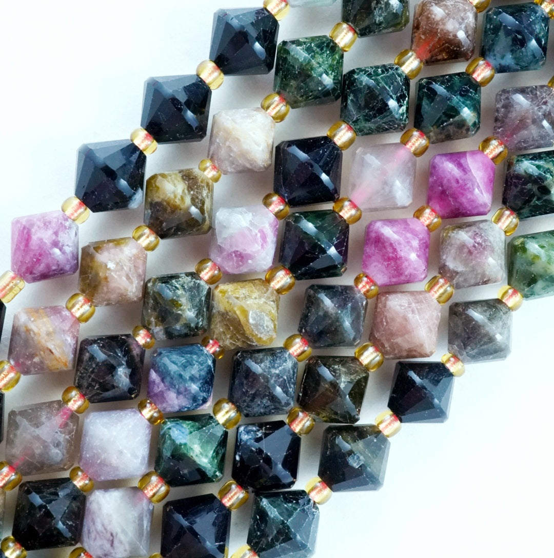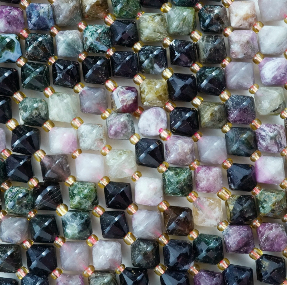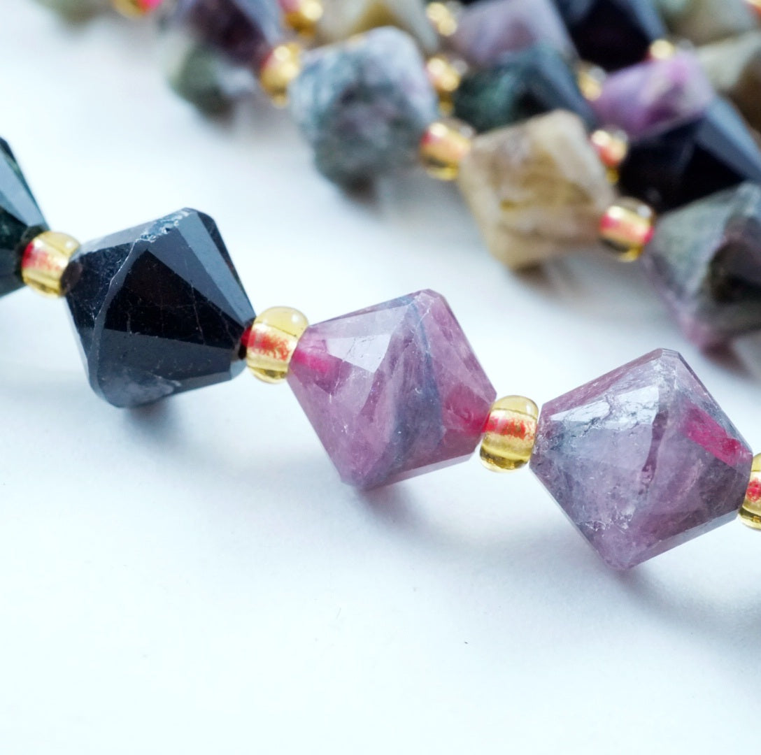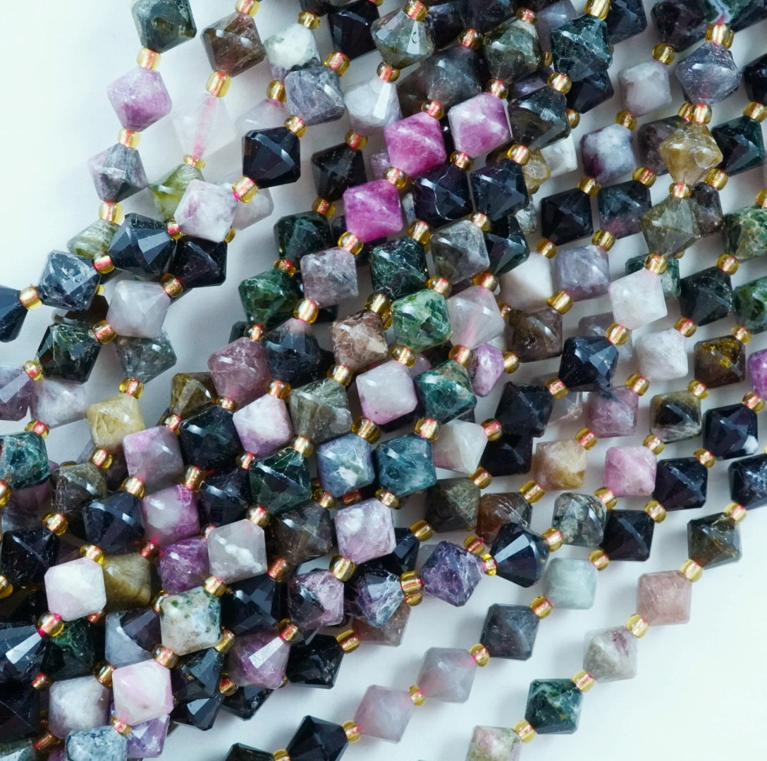 Watermelon Tourmaline is the name given to Tourmalines that are both green and pink in one crystal. These particular beads are cut and polished into beautiful faceted bicone beads.