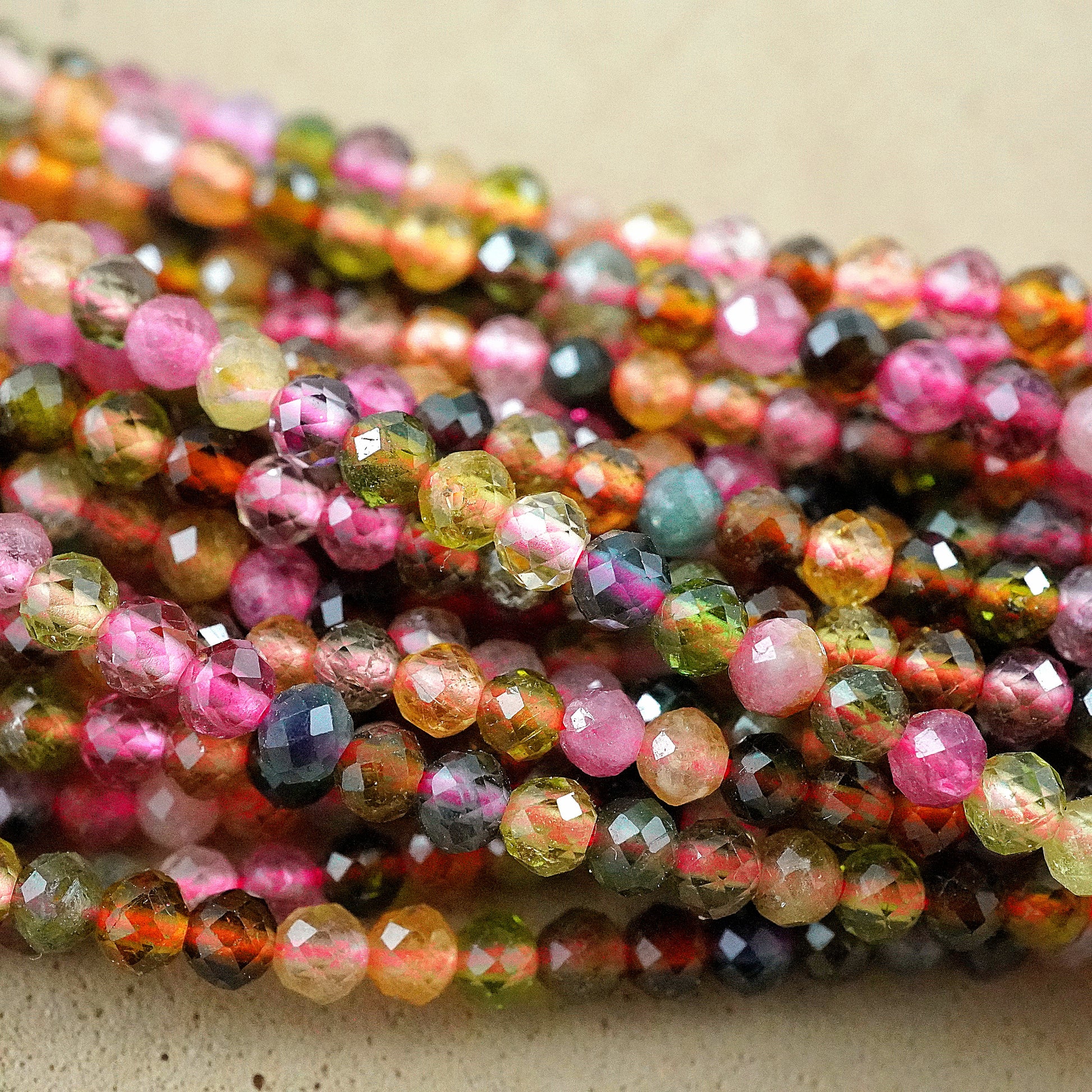 Watermelon Tourmaline is a stunning gemstone known for its captivating beauty and unique characteristics. When expertly cut into 2mm round faceted beads, it reveals an extraordinary display of colors that truly captivates the eye. These beads showcase a mesmerizing mix of vibrant green hues, ranging from light mint to deep emerald, seamlessly transitioning into gorgeous shades of pink, reminiscent of the luscious flesh of a ripe watermelon.